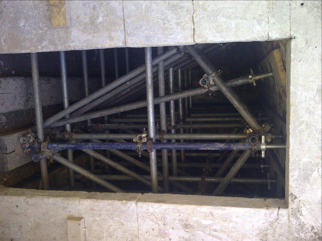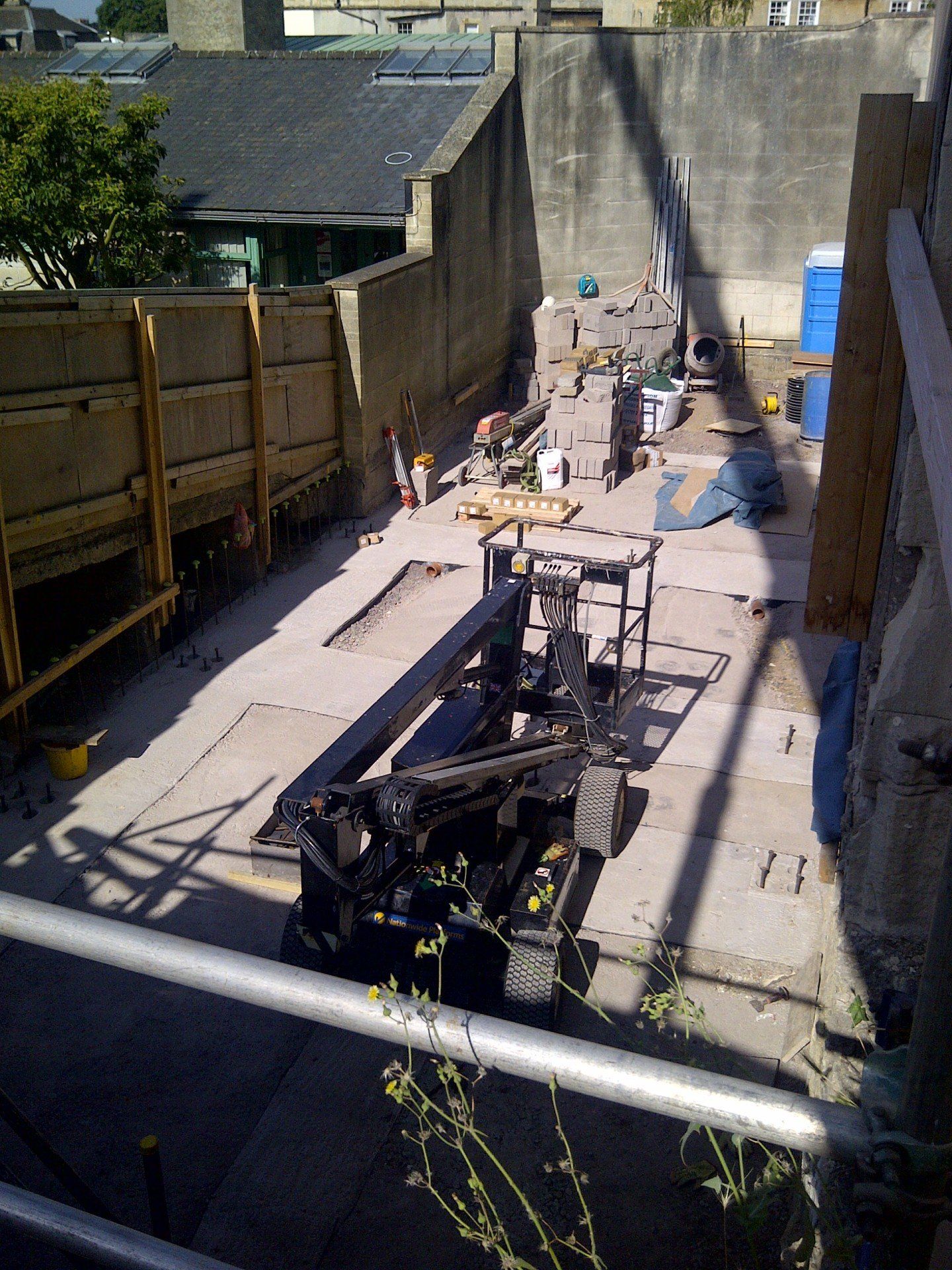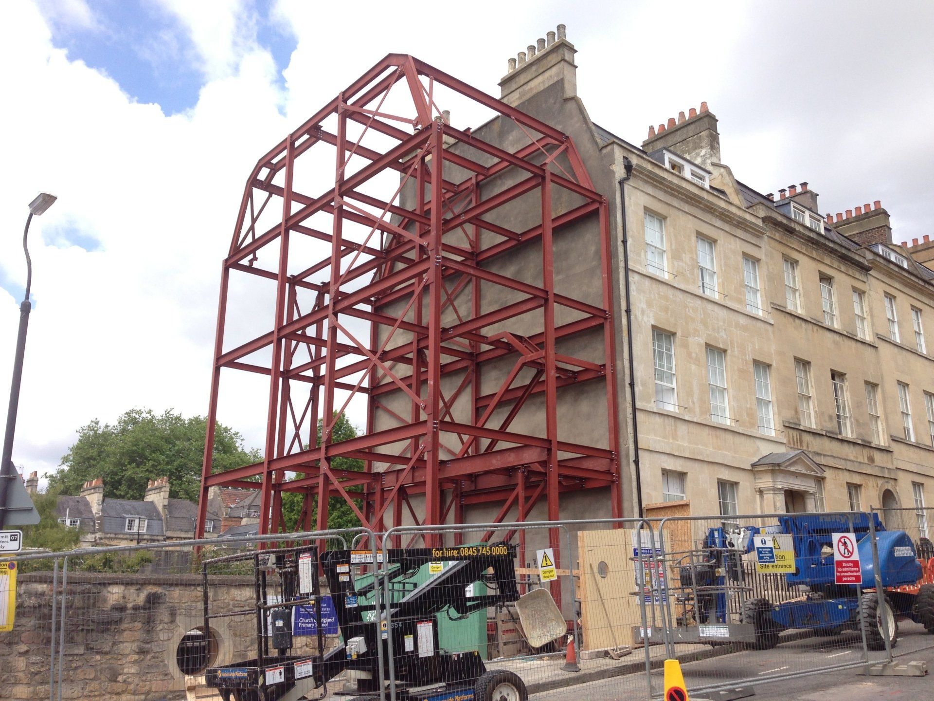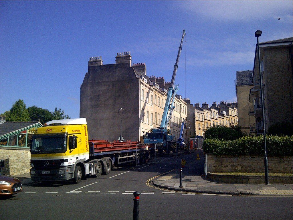 This is a 25 ton steel project we did for Ken Biggs Contractors Limited. Due to extremely limited space on site we had to do a part road closure to site the crane and the steel before it was erected. M J Ellis took responsibility for full contract lift. MJE liaised direct with Bath Council to arrange and book lane closure. Where the crane was required to sit there where old roman vaults under the road. Therefore MJE had to work with engineer and scaffold company to come up with a support design to support vault roofs from collapsing when crane sat on top. The crane had to be position to the millimetre when set up to ensure it was incorrect place and didn’t go through vault roof. Steelwork had to be unloaded off the lorry parked in the road whilst site management worked to control cars in the lane still used by motorists. Steel was set down in closed of section of road. Due to narrow confinements and steelwork starting from basement level we had to lift cherry pickers into the site build our way out.Once we had gone as far as we could we had to lift the cherry pickers out and finish erecting the steelwork from the road.