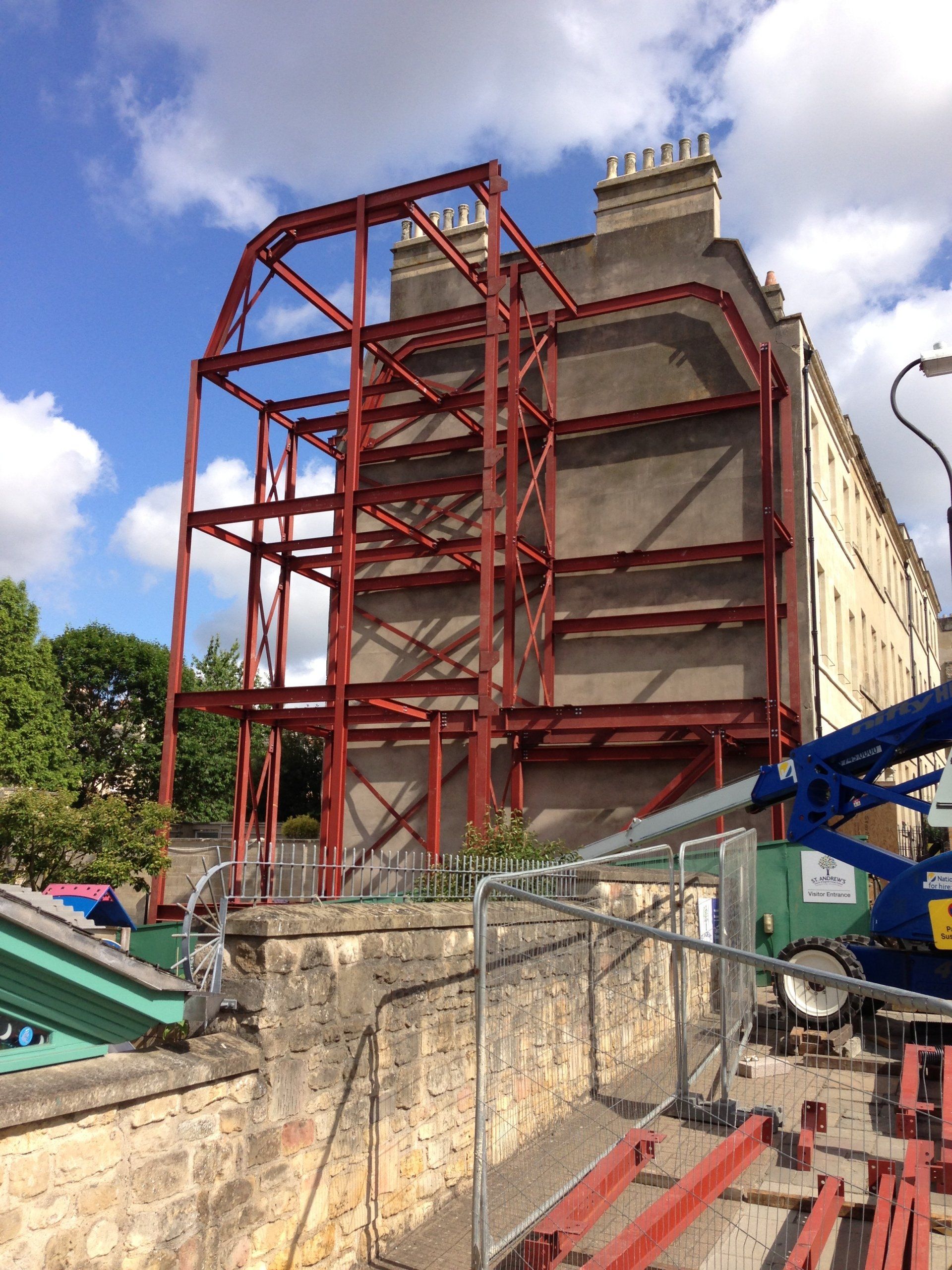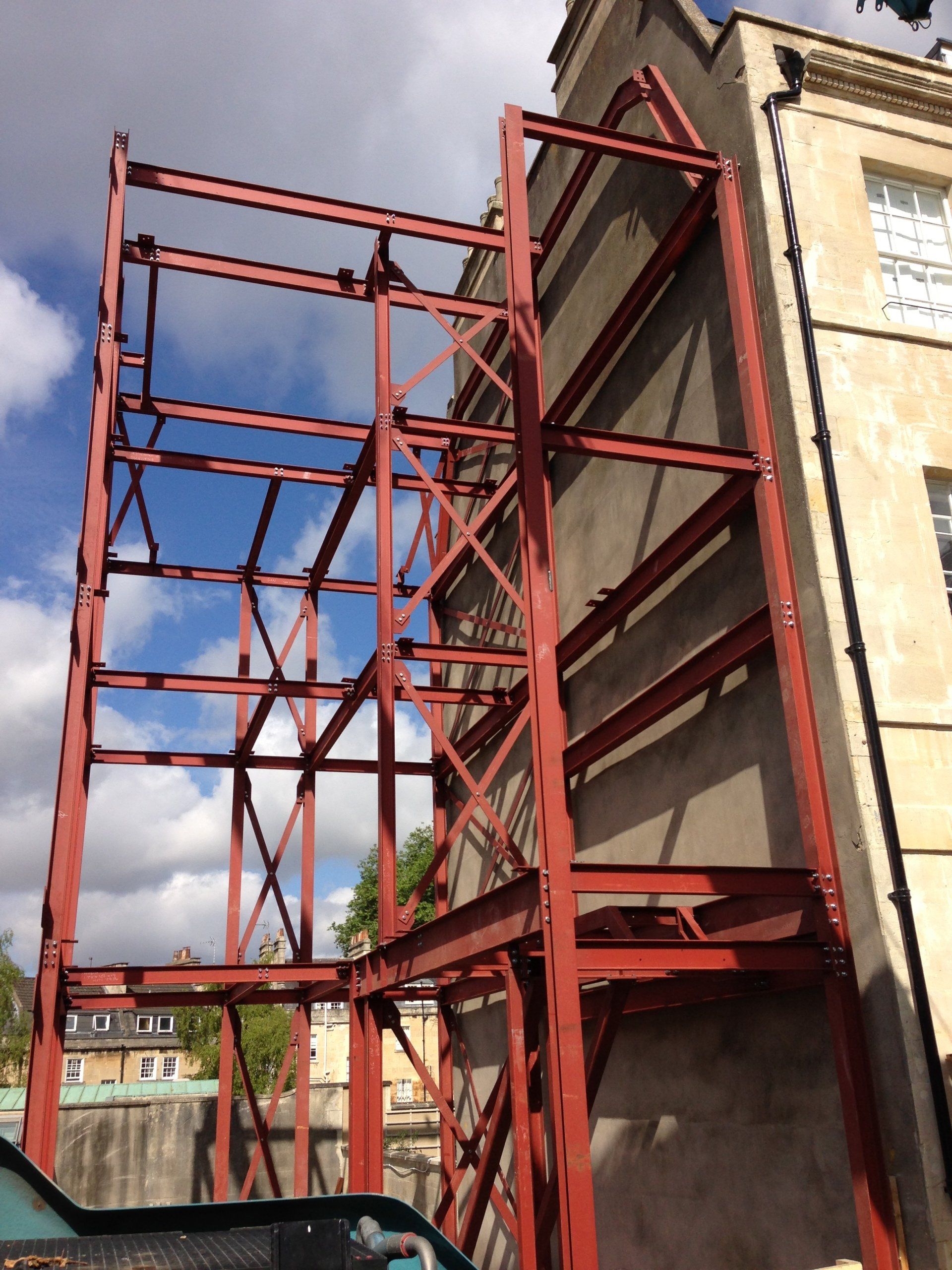 This is a 25 ton steel project we did for Ken Biggs Contractors Limited. Due to extremely limited space on site we had to do a part road closure to site the crane and the steel before it was erected. M J Ellis took responsibility for full contract lift. MJE liaised direct with Bath Council to arrange and book lane closure. Where the crane was required to sit there where old roman vaults under the road. Therefore MJE had to work with engineer and scaffold company to come up with a support design to support vault roofs from collapsing when crane sat on top. The crane had to be position to the millimetre when set up to ensure it was incorrect place and didn’t go through vault roof. Steelwork had to be unloaded off the lorry parked in the road whilst site management worked to control cars in the lane still used by motorists. Steel was set down in closed of section of road. Due to narrow confinements and steelwork starting from basement level we had to lift cherry pickers into the site build our way out.Once we had gone as far as we could we had to lift the cherry pickers out and finish erecting the steelwork from the road.